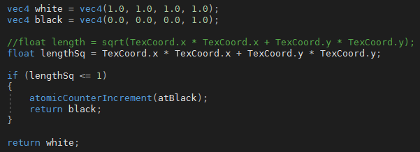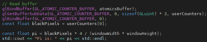 Specifically for the GPU you can use every point since that would be easier than picking random points. So you have a window of known width, and tell the GPU "if x-coord * x-coord + y-coord * y-coord < 1 then the point falls inside the quarter-circle" this is where you increment your atomics counter that you passed to the GPU, this is one of the few things you can get back from the GPU other than the colour sent to the screen.