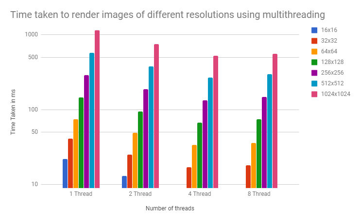I then tested the ray-tracer on different machines. Intriguingly, I found that it ran faster on a 4-core Intel CPU (an i7-4790k) than on an 8-core AMD CPU (an FX-8350). I determined that the reason for this was that even though the AMD had the same clock speed (4GHz), the Intel CPU had hyper-threading and that the AMD CPU only had 4-floating point units (it was advertised as having 8 cores because it had 8 integral units).